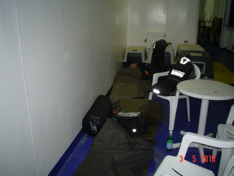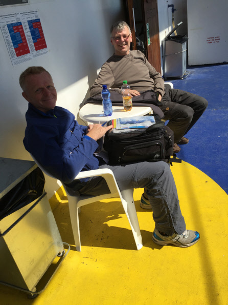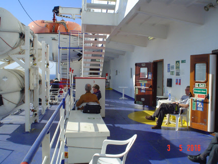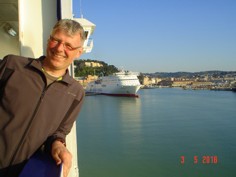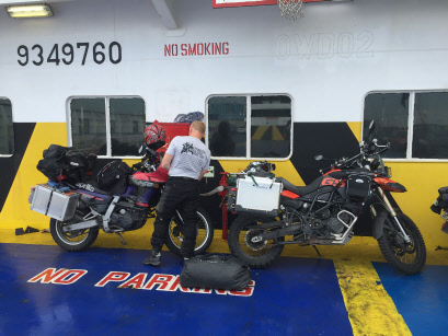 Um 12:00 Uhr sollte unsere Fähre ablegen. Um 10:00 Uhr mussten wir vom Platz sein. Die Nacht war trocken, es gab also keine Gründe die gegen unsere erfogreiche Einschiffung sprachen. Da wir eh immer relativ früh wach sind (07:00 Uhr), konnten wir schön vor unserer „Box“ frühstücken. Haben das erste Mal den Benzinkocher angeworfen, was in den folgenden Tagen dann zu Routine wurde. Die Formalitäten im Fährbüro waren innerhalb weniger Minuten erledigt. Die Auffahrt aufs Schiff war aufregend. Die Sicherung der Motorräder haben wir auf anderen Fähren schon profesioneller erlebt. Moped hinstellen und fertig war hier die Devise. Und nun begann der Teil unserer Reise, den ich am wenigsten mochte. 26 Stunden auf der Fähre. Um 14:00 Uhr am nächsten Tag sollten wir in Igoumenitsa anlegen. Tatsächlich wurden es 29 Stunden, (da die Fährlinie Treibstoff sparen wollte?). Jedenfalls haben wir als „Deckspassagiere“ ohne Kabine einen guten Schlafplatz an Deck, aber überdacht, gefunden.